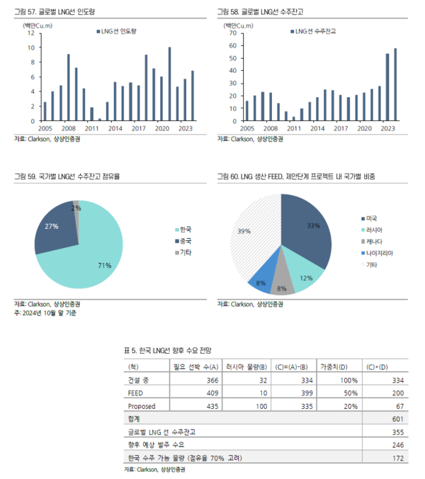 LNG선 발주 수요는 생산 프로젝트 진행 상황에 기반해 예측이 가능하다. 2024년 10월 기준 건설단계에 있는 프로젝트에서 366척, FEED 단계 프로젝트에서 409척 및 제안 단계 프로젝트에서 435척의 LNG이 필요할 것으로 예상되며 각 프로젝트의 승인 가능성, 현재 글로벌 LNG선 수주잔고, 한국 수주 점유율 등을 고려했을 때 향후 한국 수주 가능 물량을 172척으로 예상된다.