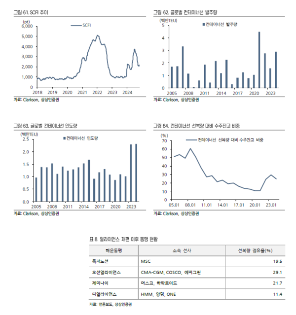 팬데믹 시기 물류 대란에 따른 운임 상승으로 컨테이너 선사들은 큰 돈을 벌게 됐으며, 실제로 글로벌 컨테이너 발주량은 2021년 역대 최고치인 451만TEU를 기록했다. 이후 2022~2024년에도 평년 대비 높은 발주량을 기록하며 컨테이너 선복량은 매년 빠르게 증가하고 있다. 수급 현황만을 고려했을 때, 이미 컨테이너선 시장은 공급 과잉 상태로 추가 발주 여력이 높다고 보기에는 어렵다. 그러나 1) 얼라이언스 재편에 따른 시장 경쟁 심화, 2) 친환경 규제 등 수급 외적인 요인들이 현재까지의 컨테이너 발주를 견인하고 있으며, 내년에도 이러한 추세는 지속될 것으로 전망된다.