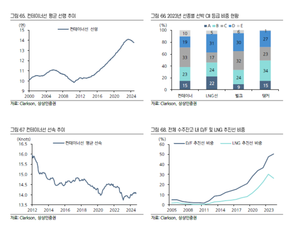 컨테이너선의 경우 비즈니스 특성 상 운항 속도에 민감해 선속을 일정 수준 이하로 감소시키기 어려워 상대적으로 빠른 선대 교체가 이뤄졌다. 그러나 기타 선종의 경우 선대 교체를 목전에 앞두고 있는 상황에서 추진 연료 노선이 명확하지 않아 주로 선속 감소 등의 단편적 방식으로 친환경 대응을 진행해 왔으며, 교체 수요가 빠르게 나타나기 어려웠다.