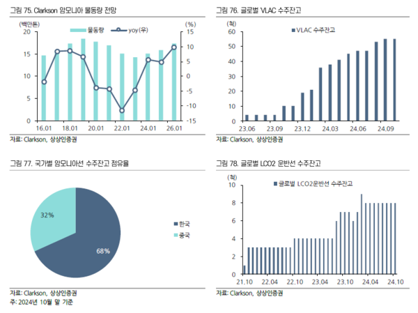 암모니아는 주요 친환경 연료 중 하나로 LNG 대비 더 많은 탄소배출량을 감축할 수 있으나 연료 활용에 높은 기술력이 요구된다. 또한, 암모니아에서 쉽게 수소를 추출할 수 있기 때문에 수소 운반용으로서의 수요 역시 존재한다. 선사들은 미래 암모니아 및 수소 수요 증가를 대비해 선제적으로 VLAC 발주를 진행하고 있다. VLAC은 수주의 약 70%를 한국 조선소가 맡고 있는 선종으로, 향후 발주 수요가 증가함에 따라 국내 조선소 수주에 기여할 것으로 판단된다.