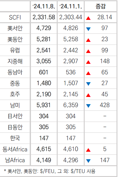 한편,美대선결과 트럼프가 당선돼 향후 높은 관세부과가 예상된다. 내년 트럼프 행정부가 관세인상을 발표하기 전까지 단기 수요가 증가하고 운임에 상승압력이 가해질 전망이다. 중장기적으로는 제품가격 상승으로 인한 교역 위축 리스크 확대, 중국-미국 직항대신 동남아 또는 남미를 통한 항로우회 증가가 예상된다.