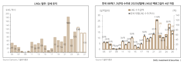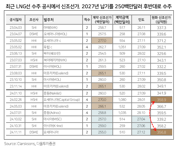 다올투자증권 최광식 애널리스트는 신조선가 상승은 필연이라고 지적했다. 최 애널리스트에 따르면 LNG선 신조선가 조금 하락은 추세가 아니라는 것이다. LNG선 신조선가가 265백만달러에서 260.5백만달러까지 조정받으면서 신조선가지수도 10월말부터 5주 연속 신조선가지수는 하락했다.
