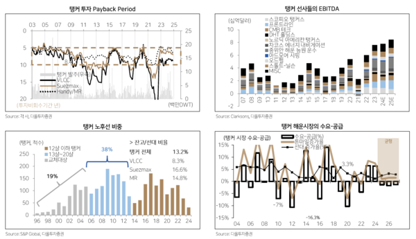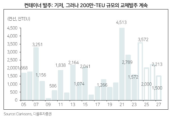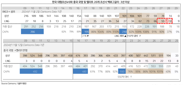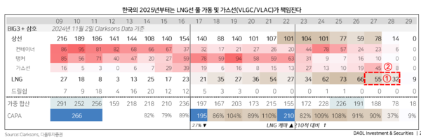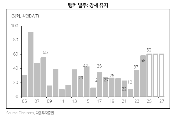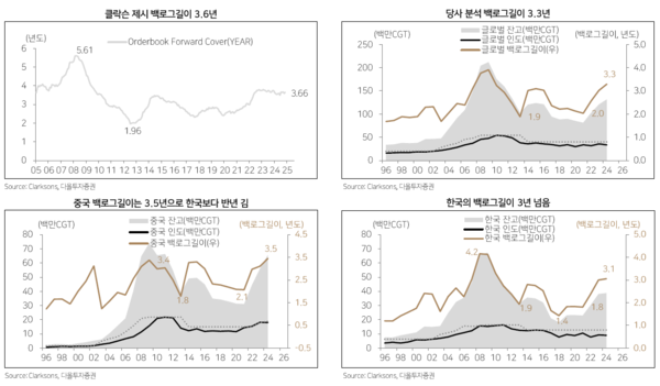 한국의 대형 조선사와 중국의 국영 및 엘리트 조선사들의 2027년 슬롯은 얼마남지 않았고 2028년에도 절반 가까이 채워져 있는 상황이다. 즉, 양대 조선국가의 백로그(수주잔량 길이)는 3년이상의 Seller’s Market이 지속되고 있다. ASP는 수요과 공급의 결과 신조선가는 신조 시장 호황과 조선사공급능력 제약 때문이다. 다올투자증권은 2025년에도 신조발주량이 112십억달러 호황이 지속되고 한국의 수주도 500억달러로 증가할 것으로 예상하기 때문에 내년에도 백로그는 늘어나고 신조선가는 오를 수밖에 없는 것으로 전망하고 있다. 이 수주 전망이 틀리더라도 백로그 3년이상에서 백로그길이가 2.5년까지 소진될 때까지 추세적으로 신조선가가 하락할 수가 없다.