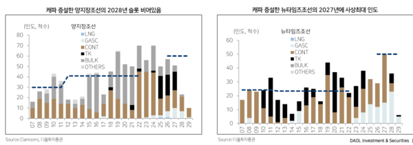하지만 이는 한국 조선사들이 2027년 단납기 LNG선 슬롯을 단골들에게 처리, 스펙이 낮은 계약건이었기 때문, 또한 260백만달러 안팎에도 신조선가는 양호하기 때문이다. 신조선가는 추세적으로 상승세를 지속할 것으로 전망된다. 2025년 LNG 신조시장 전망은 밝다고 언급했다. 2028년 LNG터미널 완공 규모는 33MPTA로 앞선 46~62MPTA나 2029년의 52MTPA보다 작다. 따라서 2027~2028년 상반기 납기의 LNG선 수요는 비교적 적다. 이에 2028년 완공 터미널을 위한 2027년의 한국조선사들의 LNG선 슬롯은 55척이 채워져 있어 10척 정도가 비어있는 상황이다.