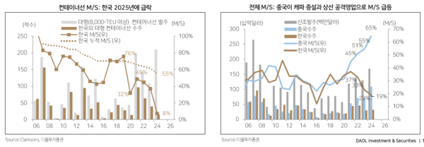중국 캐파 증설과 공격적인 도크 채우기로 올해 한국 조선업의 M/S는 크게 밀렸다. 특히 컨테이너선 시장에서는 대형선에서 과거 30~50%의 M/S가 2025년에 10%를 하회 중이다. 안타깝고 속상한 일이지만 대한민국 조선업의 경쟁력이 달라진 것에서 비롯된 것은 아니다.