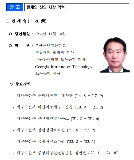 변재영 신임 사장은 1996년 기술고시 31회로 공직에 입문하여 해양수산부 마산지방해양수산청장, 부산항건설사무소장, 국립해양조사원장 등 주요 보직을 두루 역임하였다.