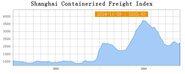 컨테이이너 운임지수 SCFI와 CCFI가 오랜만에 동반 상승했다. 11월 29일 상하이항운교역소에 따르면 스팟 컨운임 지표 SCFI(상하이발컨운임지수)는 2233.83p로 전주 2160.08p보다 73.75p(3.4%) 상승해 반등에 성공했다. 중장기 계약운임 지표 CCFI(중국발컨운임지수)는 1474p로 전주 1467.91p보다 0.4% 상승하며 전주에 이어 오름세를 이어갔다.