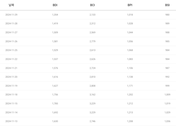 한편 건화물선운임지수 BDI는 11월 29일(금) 1354p를 기록해 22일(금) 1537p 보다 12%나 하락했다.
