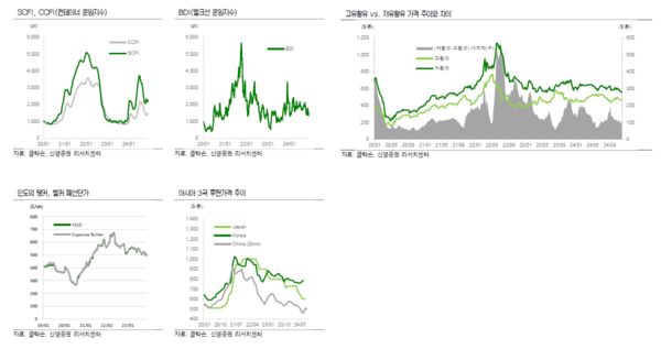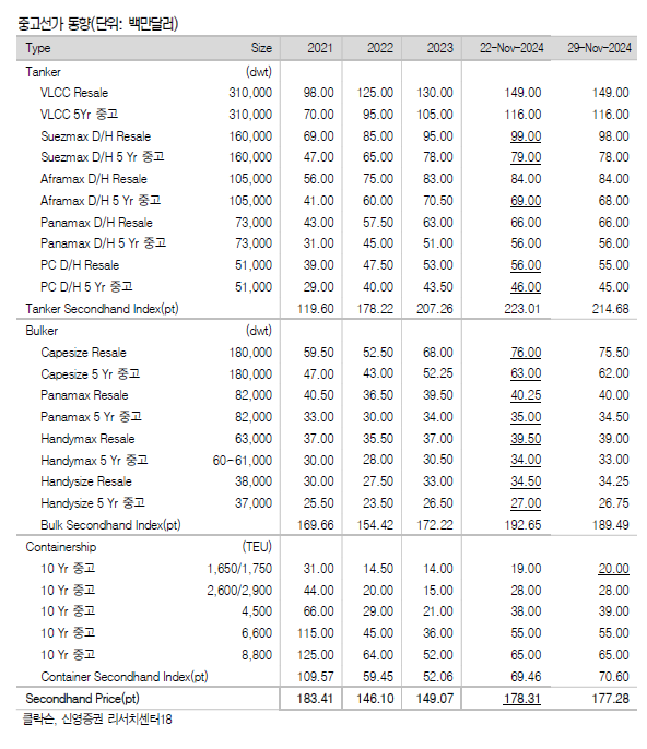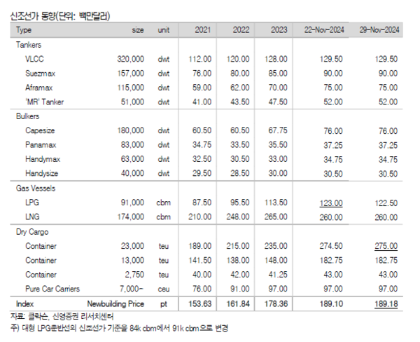 지난 주 신조선가는 다시 반등했다. 중고선가지수는 하락했다. 신영증권 엄경아 애널리스트에 따르면 2024년 48주차(11월 29일) 신조선가지수는 전주대비 0.29포인트 하락한 189.13p를 기록했다. 선종별 상세선가를 보면 가스선 중 9만1000cbm급 LPG선이 50만달러 하락했다. 컨테이너선 중 2만3000TEU급은 50만달러 올랐다.