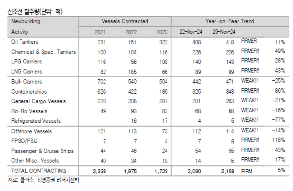 수주량은 오일탱커 10척, LPG선 3척, 드라이벌크선 29척, 컨테이너선 18척, 제너럴카고선 2척, 항온선 1척, 부유식해양생산선 1척, 여객선 및 크루즈선 1척, 기타 선박 1척 등 총 68척을 기록했다. 48주차 누적수주량은 2158척이며 2023년 동기 누적수주량은 1556척이었다.