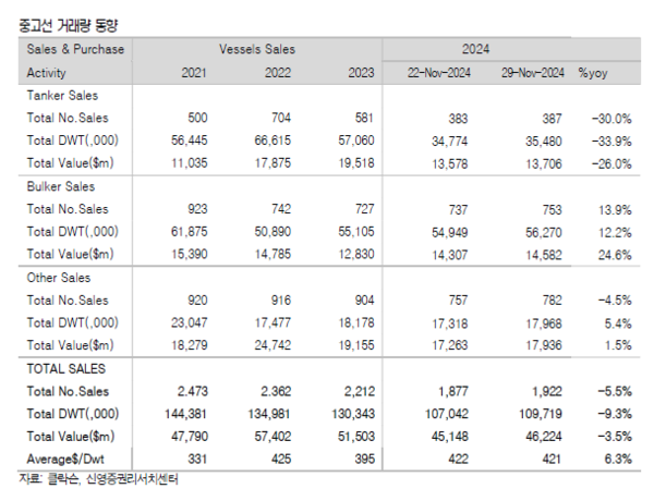 파나막스급 리세일가격은 25만달러 하락했고 5년 중고선가는 50만달러 내렸다. 핸디막스급 리세일가격은 50만달러 하락했고 5년 중고선가는 1백만달러 하락했다. 핸디사이즈급 리세일가격은 25만달러 내렸고 5년 중고선가도 25만달러 하락한 것으로 집계됐다. 컨테이너선 중 1700TEU급 10년 중고선가는 1백만달러 상승했고 4500TEU급 10년 중고선가는 1백만달러 올랐다. 48주차 중고선 거래량은 45척을 기록했다. 누적기준으로는 1922척 거래됐으며 전년동기 기준 누적거래량은 2033척이었다.