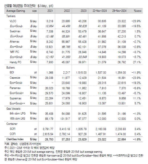 건화물선운임지수 BDI는 전주대비 11.9% 하락한 1354포이트를 기록했다. 대형선 운임이 23.9% 하락한 1만6319달러, 파나막스급은 5.6% 내린 7370달러, 수프라막스급은 11.1% 상승한 9858달러를 기록했다. 가스선 운임은 VLGC 운임이 1.3% 하락한 3만1186달러를 기록했다. 대형 LNG운반선(16만급)은 전주와 동일한 1만2000달러를 기록한 것으로 나타났다. 중국컨테이너운임지수 중 SCFI는 전주대비 3.4% 상승한 2233.83p를 기록했고 CCFI는 전주대비 0.4% 상승한 1474.00p를 기록했다.