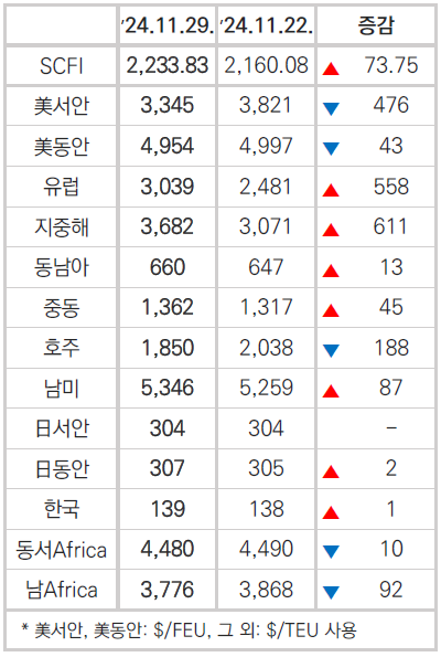 유럽지역 수요는 견조했으며, 주요 선사들은 임시결항 및 12월 1일부 GRI등을 통해 운임상승을 유도했다. 선사들은 연간 계약협상에서 유리한 고지를 차지하기 위해 현재보다 운임을 상승시키기 위해 노력 중이며, 이에 연말까지 추가 운임인상이 있을 수 있다.