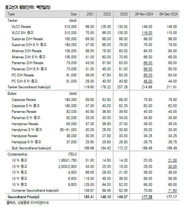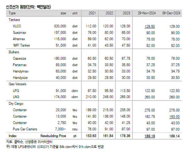 신조선 발주시장이 쉼없이 돌아가고 있다. 지난 주 신조선가지수와 중고선가지수 모두 하락했다. 신영증권 엄경아 애널리스트에 따르면 2024년 49주차(12월 6일) 신조선가지수는 전주대비 0.04포인트 하락한 189.14p를 기록했다. 선종별 상세선가는 탱커 중 VLCC가 50만달러 하락했다.컨테이너선 중 1만3,000TEU급은 25만달러 올랐다.