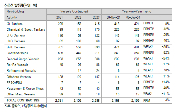 수주량은 오일탱커 3척, 드라이벌크선 13척, 컨테이너선 16척, 해양지원선 9척 등 총 41척을 기록했다. 49주차 누적수주량은 2,199척이며, 전년동기 누적수주량은 1,593척이었다.