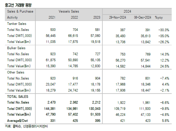 49주차 중고선거래량은 39척을 기록했다. 누적기준으로는 1,961척이 거래됐으며, 전년동기 기준 누적량은 2,099척을 기록한 것으로 나타났다.