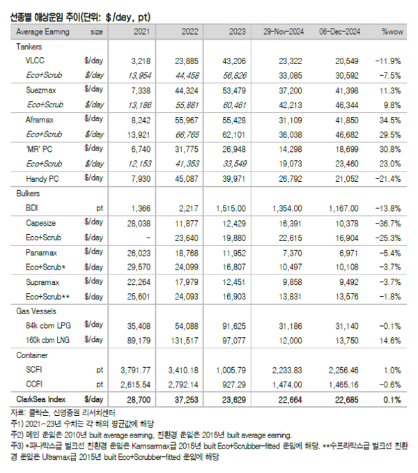 한편 해상운임의 경우 탱커는 강세로 전환됐고 벌커는 약세, 컨테이너선은 혼조세를 보였다.