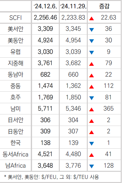 추수감사절 이후 물류혼잡 완화와 설연휴 대비 계절적 물량 증가로 소폭 상승했다. 필리핀 및 인도네시아항로에서의 강세가 주요 요인으로 작용했으나, 베트남항로는 선사간 경쟁심화로 상승폭이 제한됐다.