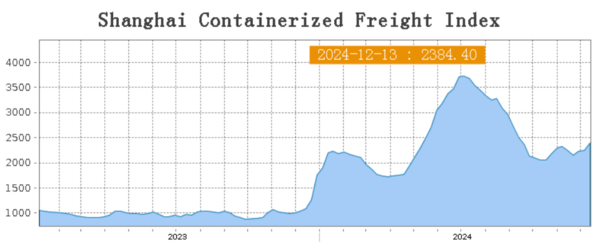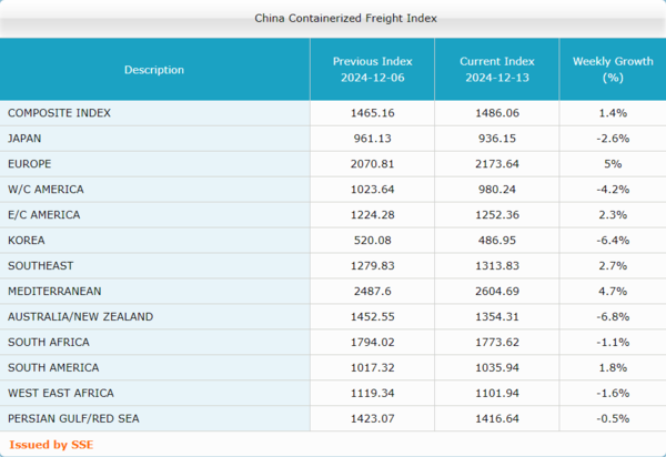 상하이항운교역소에 따르면 13일(금) SCFI는 2384.4p를 기록해 전주(2256.46)대비 127.94p(5.6%) 상승했다. CCFI는 13일 1486.06p를 기록해 전주(1465.16)보다 1.4% 올랐다.