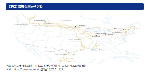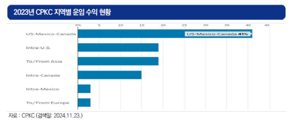 향후 트럼프 정부 출범에 따라 캐나다, 멕시코 추가 관세로 물동량 규모 축소가 예상되면서 지난해 전체 매출의 41%가 북미 국경 간 철송에서 발생한 CPKC의 사업에도 난항이 전망된다.
