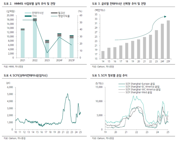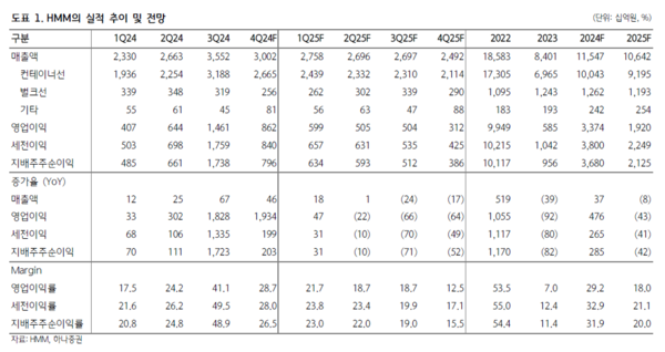 따라서 HMM의 2025년 매출액은 10.6조원(-8% (YoY)), 영업이익은 1.92조원(-43%, 영업이익률 18.0%)으로 추정된다. 컨테이너선 해상운임이 기존 예상 대비 높은 수준에서 유지될 것으로 전망하며 추정치를 상향 조정했다.