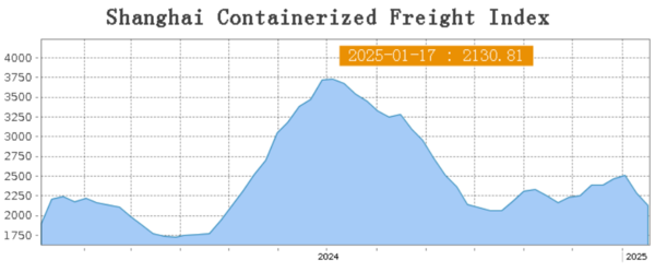 상하이항운교역소에 따르면 17일 스팟 컨운임 지표 SCFI(상하이발컨운임지수)는 2130.81p로 전주(2290.68)보다 159.87p(-7%)내렸다.