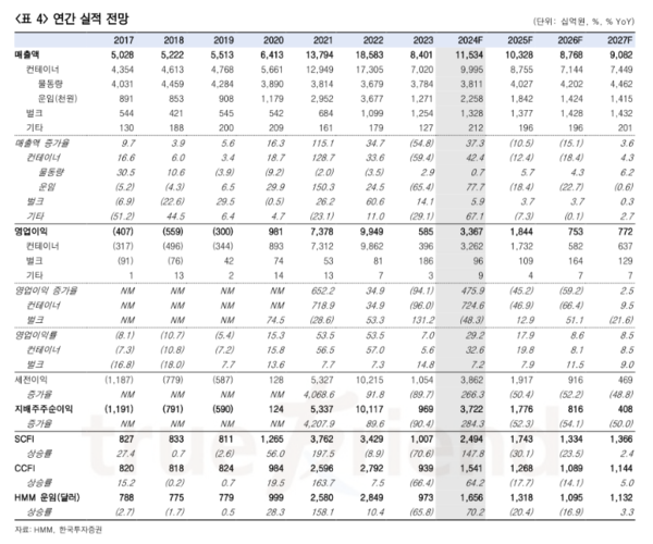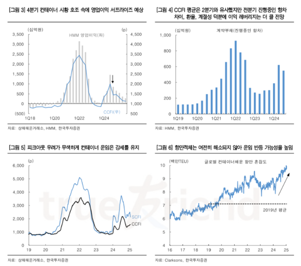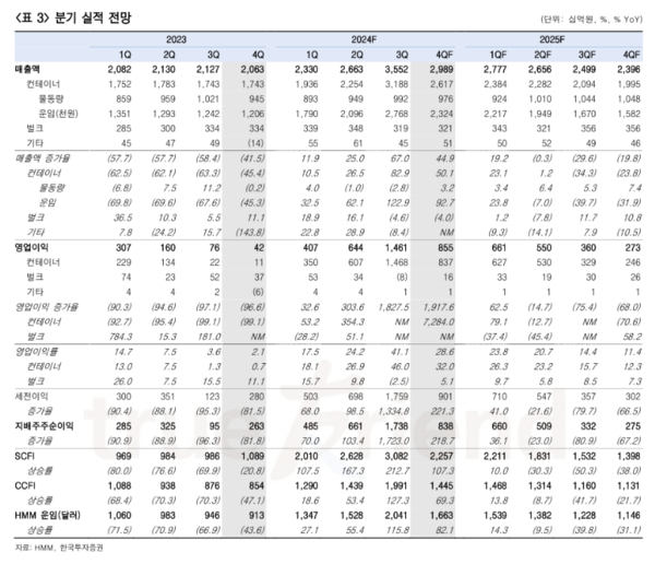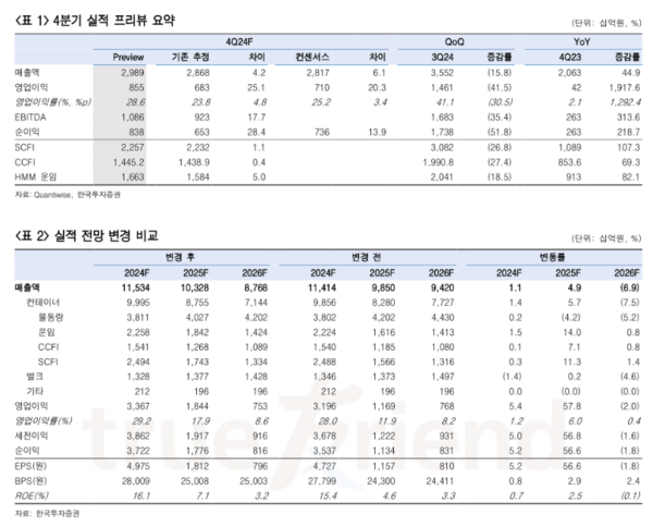 HMM의 작년 4분기 영업이익은 컨센서스를 상회할 전망이다. 한국투자증권 최고운 애널리스트에 따르면 2024년 4분기 실적은 시장 기대를 뛰어넘을 전망이다. 영업이익은 8550억원으로 컨센서스를 20% 상회할 것으로 보인다.