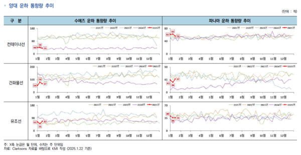 24일 CCFI 항로별 추이를 보면 유럽항로 5.8%, 동남아항로 4.5%, 미동안항로 3.1% 각각 하락했고, 반면 미서안항로는 1.6%, 한국항로 3.6% 각각 상승했다.