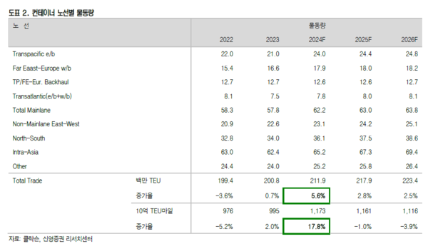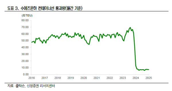 월간단위 수에즈운하를 통과하는 컨테이너선박의 선복량은 홍해사태 전 대비 10분의 1로 감소했다. 이에 따라 2024년 연간 컨테이너 물동량은 5.6% 증가했음에도 불구하고, 톤마일 기준 수요는 무려 17.8%나 증가했다. 이로 인해 2021년 이후 대량발주된 컨테이너 선박이 인도되면서 10%가 넘는 컨테이너선 공급증가가 있었지만, 공급과잉 영향을 받지 않는 한 해가 됐다.