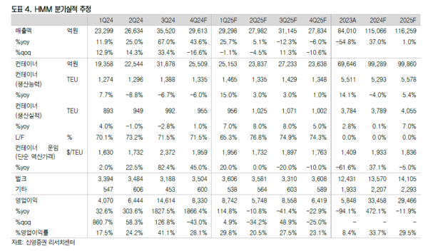 2025년 컨테이너 시장운임은 상반기보다 높은 하반기 운임을 기대하기 어렵다. 그럼에도 불구하고 노선운영에 불확실성이 있으며 운임 움직임에 후행하는 계약운임 적용으로 극단적인 영업손실이 예상되지는 않는다. 2024년 4분기 호실적이 오히려 투자심리에 긍정적인 영향을 줄 것으로 판단된다.