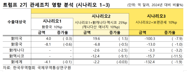 한국무역협회(KITA, 회장 윤진식) 국제무역통상연구원은 9일(일) 발표한 ‘트럼프 2기 행정부 관세조치에 따른 영향 분석’ 보고서를 통해, 미국의 관세부과 시나리오별 우리 수출에 미치는 영향을 분석했다. 시나리오는 ▲對중국 10%p 추가 관세부과(시나리오1) ▲시나리오1+對캐나다·멕시코 25%p 관세부과(시나리오2) ▲시나리오2+보편관세 10%p 부과(시나리오3) 총 3단계로 구성됐다.