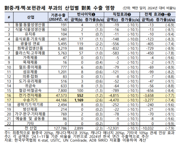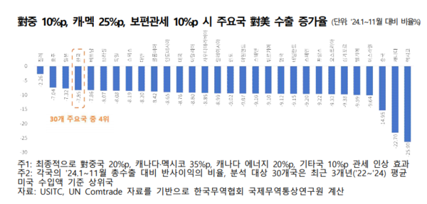 - 보편관세 도입돼도 對美수출 감소폭 칠레, 호주, 일본에 이어 4위로 상대적 선방 -