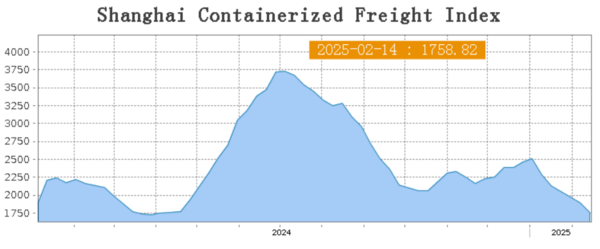 컨테이너운임지수 하락세가 지속되고 있어 업계가 긴장하고 있다. 상하이항운교역소에 따르면 14일 스팟 컨운임 지표 SCFI(상하이발컨운임지수)는 1758.82p로 전주 7일(1896.65) 대비 7.27%(-137.83p) 급락했다. 중장기 계약운임 지표 CCFI(중국발컨운임지수)는 14일 1387.16p로 전주보다 2% 내렸다.