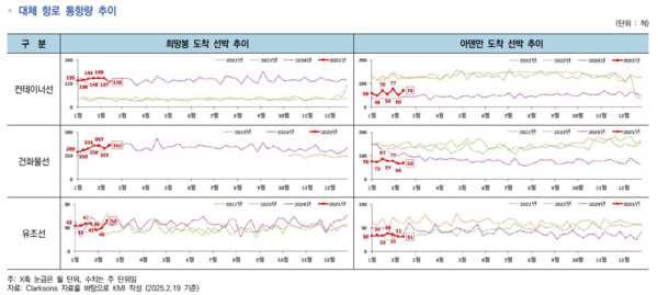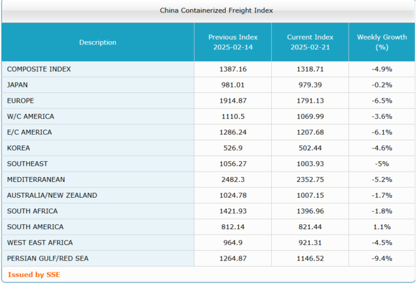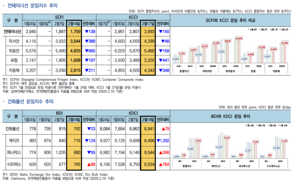 CCFI 항로별 추이를 보면 중동항로가 전주대비 9.4% 급락하며 항로 중 가장 큰폭의 하락세를 보였다. 유럽항로는 6.5%, 미동안항로는 6.1% 각각 내렸다. 동남아항로는 5% 하락했고 한국항로는 4.6% 하락한 것으로 나타났다.