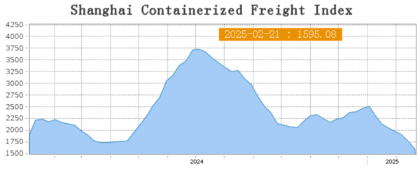 스팟 컨운임 지표 SCFI(상하이발컨운임지수)의 하락 폭이 갈수록 커지고 있어 업계가 초긴장하고 있다. 상하이항운교역소에 따르면 21일 SCFI는 1595.08p로 전주 1758.82p보다 9.31%(-163.74p)나 급락했다.