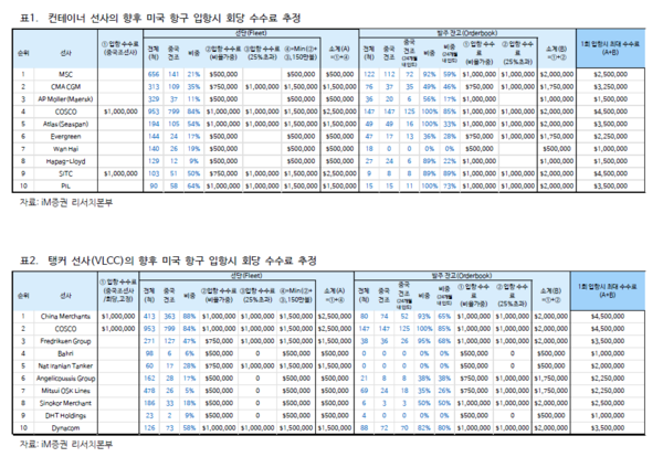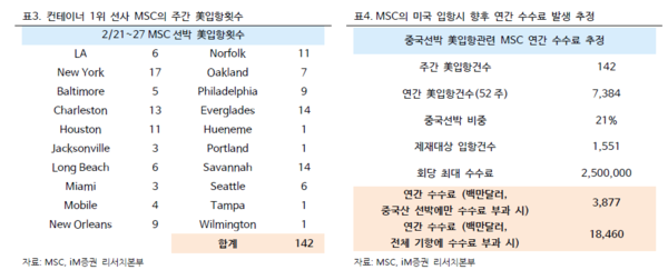 컨테이너 1위 선사인 MSC의 경우 입항 1회당 수수료는 $2,500,000으로 추정하며, 선단 중 중국산 선박의 비중(21%) 및 연간 미국 기항 횟수(약 7천회)등을 바탕으로 계산하면 동사의 연간 수수료 부과액은 약 39억 달러~최대 185억 달러에 이를 수도 있다는 계산이 나온다.