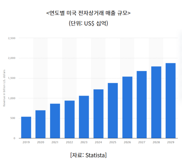 이처럼 큰 시장에서 약 10%의 증가는 상당한 성장을 의미하며, 미국 소비자들이 전자상거래를 활발하게 이용하고 있음은 물론 온라인 쇼핑에 대한 선호도가 더욱 높아지고 있음을 보여준다. 글로벌 리서치 업체 Statista 통계 자료에 따르면, 미국 전자상거래 시장은 꾸준히 성장해 2029년에는 1조9000억 달러에 이를 것으로 예상된다.