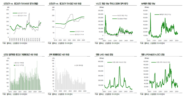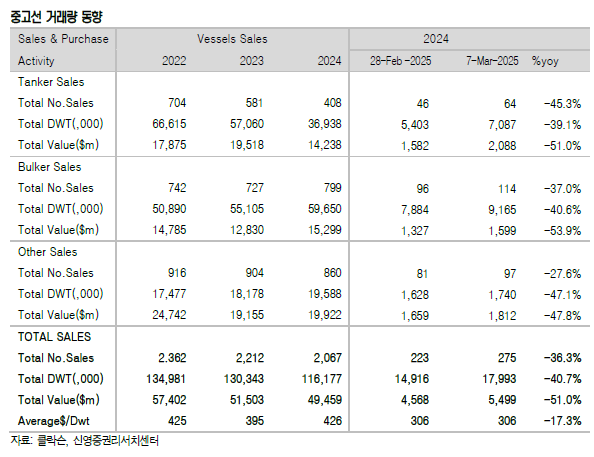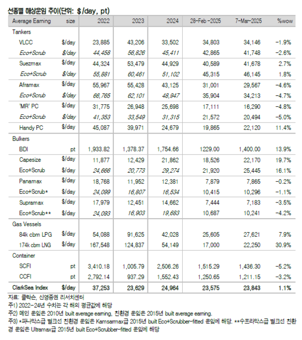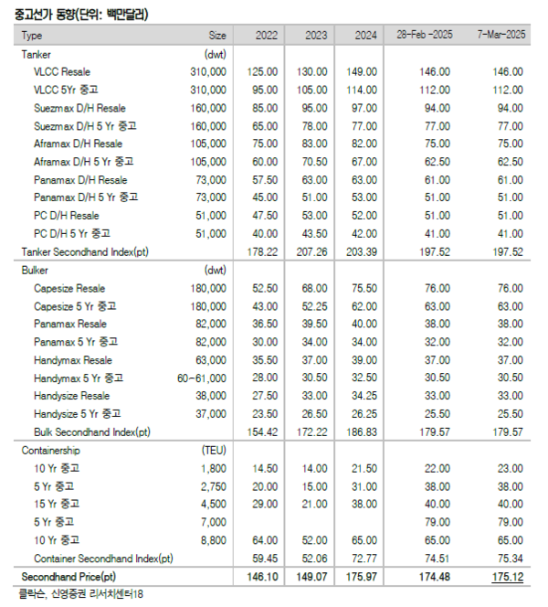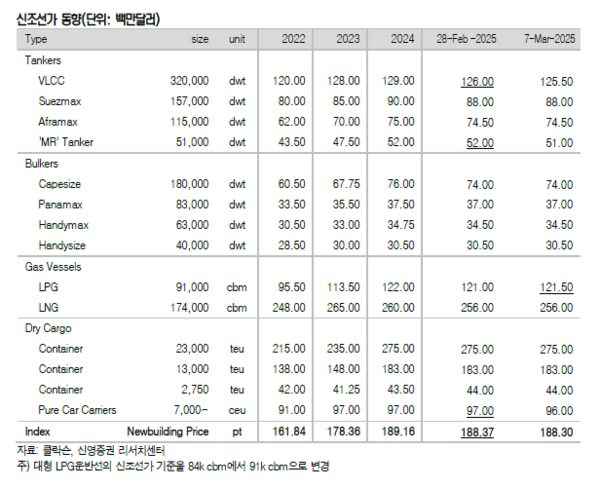 해운시장 비수기 탈출의 모습을 보여주고 있다. 지난 주 신조선가지수는 하락했고 중고선가지수는 상승했다. 신영증권 엄경아 애널리스트에 따르면 10주차(3월 7일) 신조선가지수는 전주대비 0.07포인트 하락한 188.30p를 기록했다. 선종별 상세선가는 탱커 중 VLCC가 50만달러 하락했고 MR탱커는 1백만달러 내렸다. 드라이벌크선은 변동이 없었다. 가스선 중 91k(9만1000)cbm급 LPG선은 50만달러 상승했다. 컨테이너선도 변동이 없었다. 7,000CEU급 자동차운반선 신조선가는 1백만달러 하락했다.