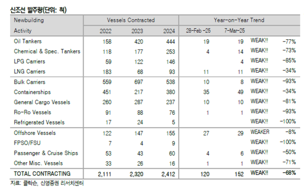10주차 수주량은 케미칼 및 특수선 10척, LPG선 4척, 벌크선 2척 취소, 컨테이너선 14척, 해양지원선 2척, 여객선 및 크루즈 2척 등 총 32척을 기록했다. 누적 수주량은 152척이고, 전년동기 누적수주량은 257척을 기록한 것으로 나타났다.