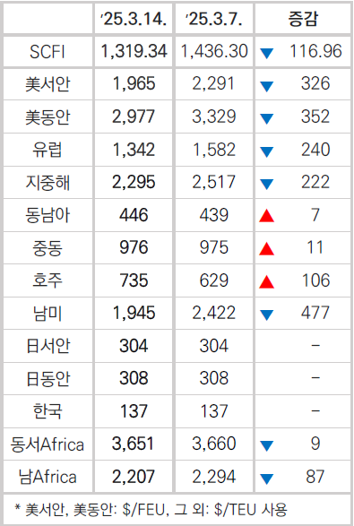 미주항로의 경우 미서안이 15개월만에 2000선이 붕괴됐고 동안은 3000선 하회를 기록했다.