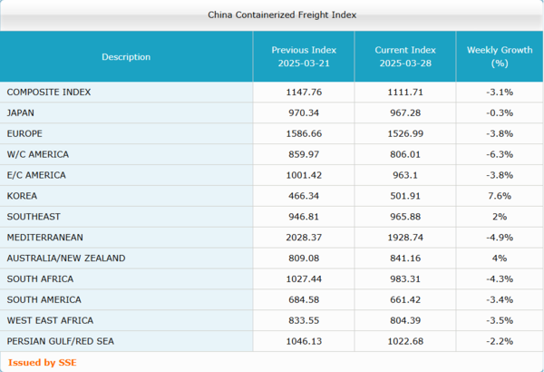 중장기 계약운임 지표 CCFI(중국발컨운임지수)는 1111.71p로 전주 1147.76p보다 3.1% 하락했다.