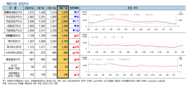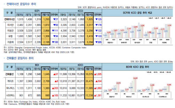21일 SCFI는 1292.75p로 전주대비 26.59p(2%) 하락했고 CCFI는 1147.76p로 전주보다 3.7% 하락했었다.