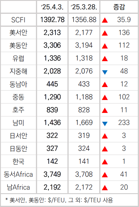 4월초 GEMINI 얼라이언스가 3항차 추가결항을 예고함에 따라 월초 공급은 다소 타이트할 것으로 보이며, 4월중반부터 MSC의 24,000TEU 선박 추가투입 및 오션얼라이언스 공급 증가가예정돼 수급불균형은 계속될 것으로 보인다.
