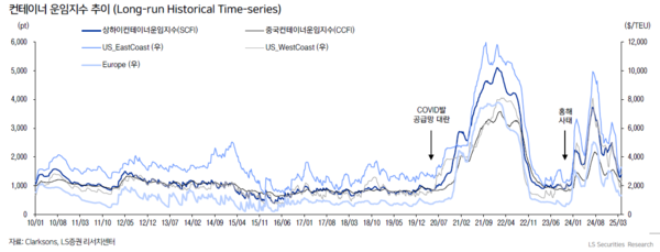 올해 컨테이너 정기선해운은 단기 호시황이 지속되지만 점적으로 우하향 전망이다. LS증권 이재혁 애널리스트에 따르면 상하이컨테이너운임지수 SCFI는 4월 11일 현재 1394.68p로 연초대비 44% 하락했다. 홍해사태에 따른 선사들의 수혜는 지난 장기계약 효과에 따라 당분간 지속될 전망이다. 3월 17일 이스라엘 가자지구 공습이 재개됐다. 홍해 우회 운항 기조는 2025년 내내 이어질 것으로 예상된다.