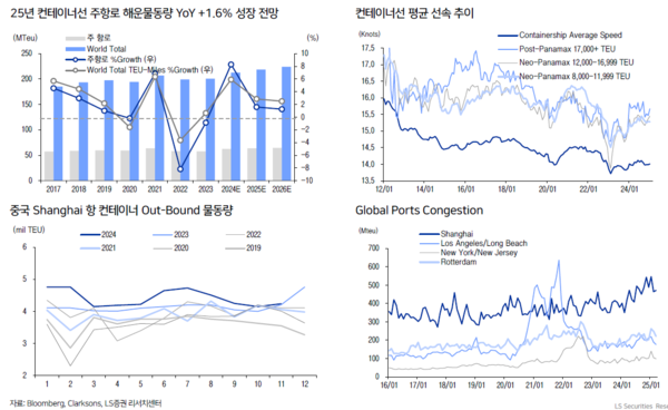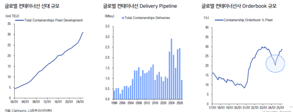 수요는 눌리고(↓) 공급은 늘어나는(↑)는 이중고다. 기발주 신조선 인도 본격화에 따른 선복량 상승 우려는 여전히 상존한다. 트럼프 2기 행정부 출범이후 관세전쟁 본격화와 리쇼어링 기조가 확대됐다. 글로벌 무역/해운 수요 성장 위축 우려가 확대됐다.