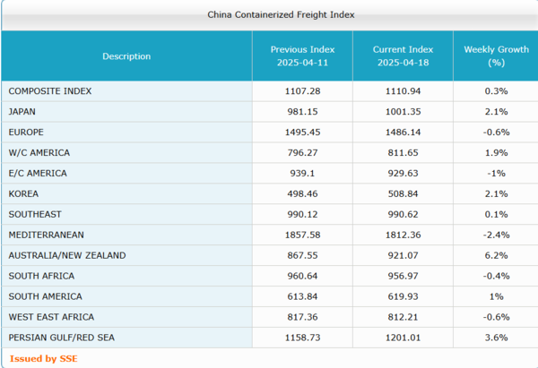 CCFI는 18일 1110.94p로 전주대비 0.3% 올랐다.