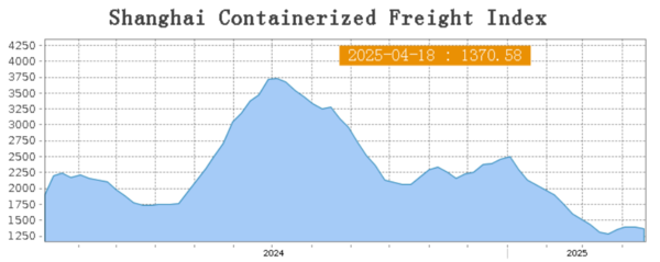 상하이항운교역소에 따르면 4월 18일 SCFI는 1370.58p로 전주(11일) 대비 24.1p(1.7%) 내렸다.