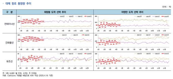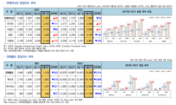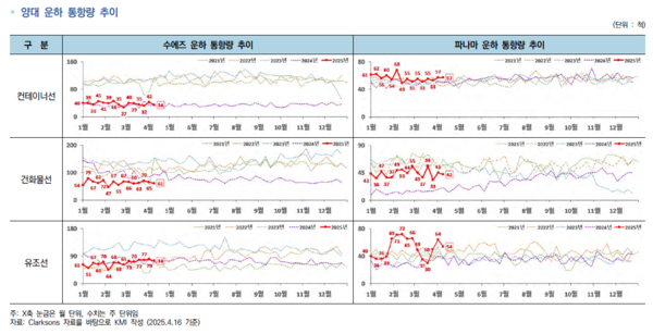 항로별 CCFI 추이를 보면 미서안은 1.9% 상승한 반면 미동안은 1% 하락했다. 유럽항로는 0.6%, 지중해항로는 2.4% 각각 내렸다. 동남아항로는 0.1%, 중동항로는 3.6% 각각 상승했다. 한국항로는 2.1% 올랐다.