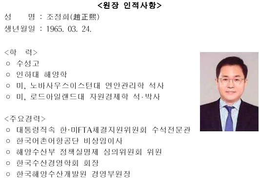 조정희 원장은 대통령직속 한·미 FTA체결지원위원회 수석전문관, 한국어촌어항공단 비상임이사, 해양수산부 정책실명제 심의위원회 위원, 한국수산경영학회 회장, 한국해양수산개발원 경영부원장 등 을 역임한 바 있다.