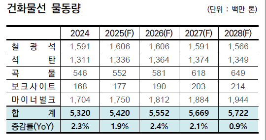 2026년에는 보크사이트, 미국/남미/흑해 곡물 물동량 증가로 2.4% 전망되나, 이후 성장세가 둔화될 것으로 보인다.